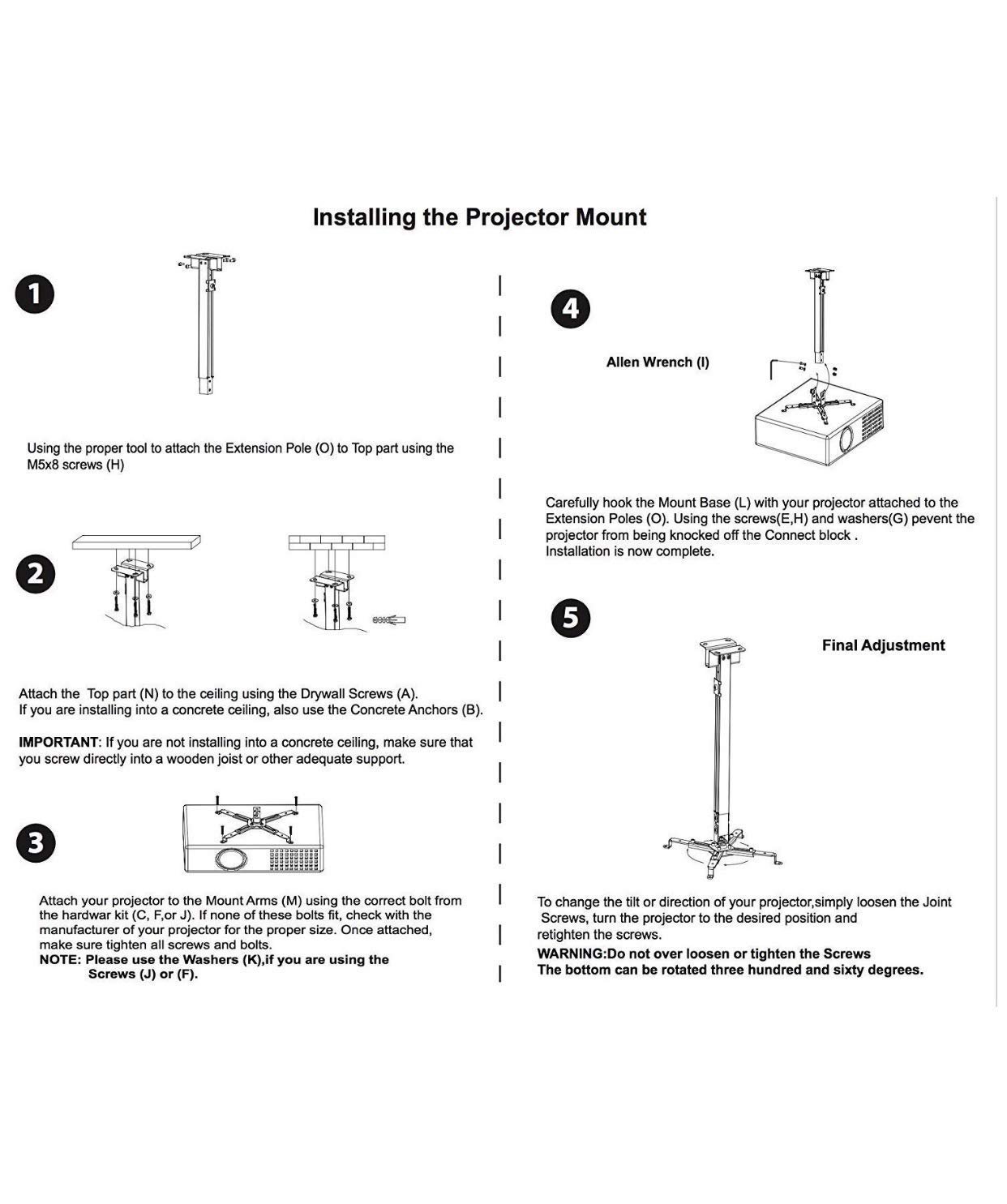 • Adjustable drop pole : 12″ – 24″ . These Projector Ceiling Mount Bracket’s are ideal for Projector installations at Homes , Office’s, Cafe’s, Restaurant’s, Hotel’s, Factories, School’s, Conference Room’s, Clinic’s, Hospital’s and more .