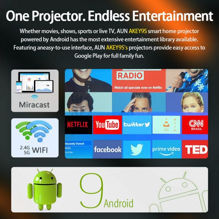 300″ Mega Projection Screen: Features a huge projection screen, AKEY9 projector provides a screen size of 42”-300” with projection distance varies from 4.7ft-30.18ft.