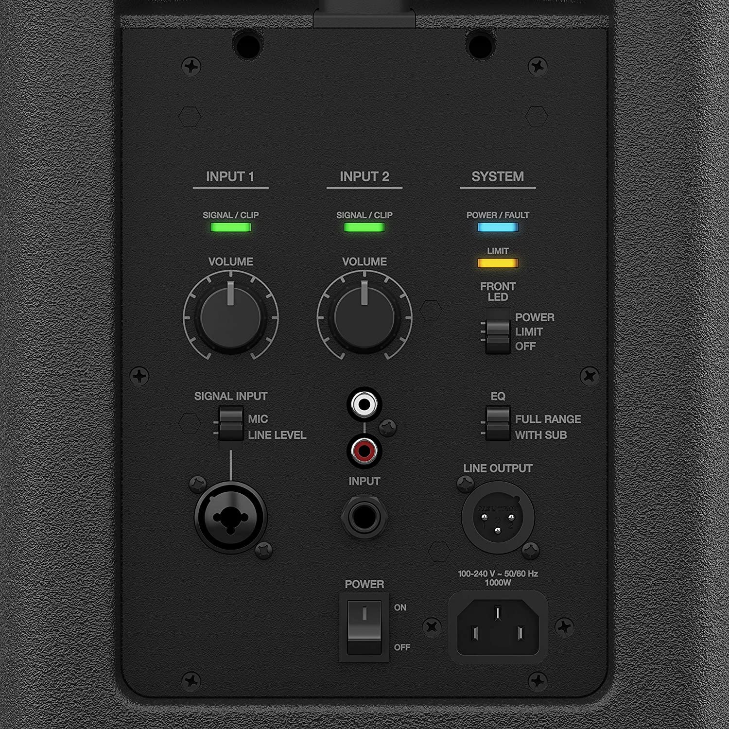 • 2 input channels with independent volume controls and Line Level/Mic switch on Channel 1 | Wide, consistent coverage from an 8-driver mid/high line array, with each driver mounted on a custom 100° waveguide