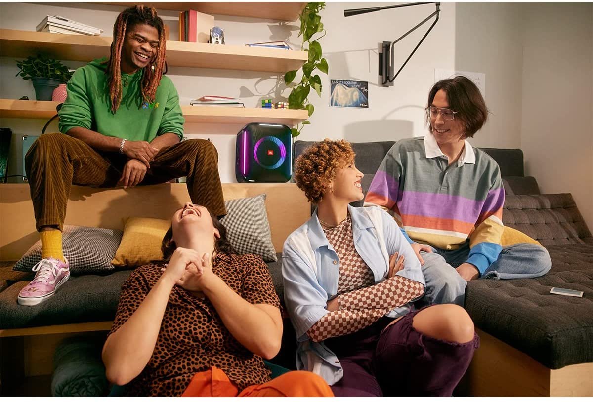 No plug? No problem. The JBL PartyBox Encore Essential keeps the party going wherever you are with up to 6 hours of play time.